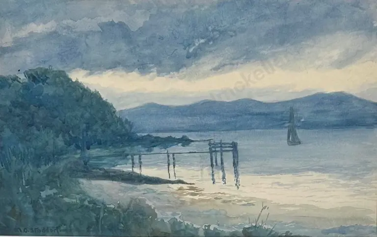 M O Stoddart - Lyttelton Harbour, watercolour, 280x440mm