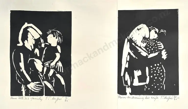 Trevor Moffitt - Miner with his Family 21/24 and Miner embracing his Wife 21/25, woodcut print, Estimate: $800 - $1,600