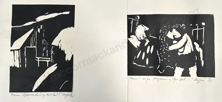 Trevor Moffitt - Miners Wife preparing for Bed 21/25, Miner approching his Hut 21/24, woodcut print Estimate: $800 - $1,600