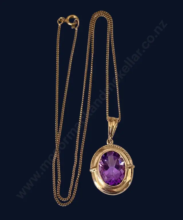 9ct Gold Amethyst Oval Drop Pendant on Chain L48cm TW7.9gms, Valuation $570.00 Estimate: $450 - $900