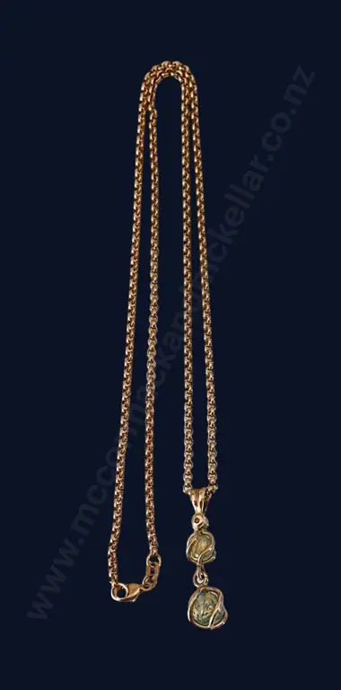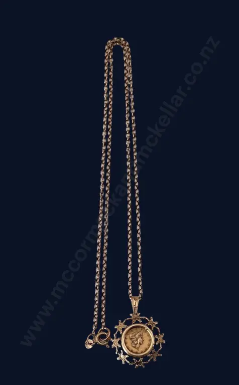 9ct Gold Necklace with 9ct Mounted Republic Camala 1 Tallar, 1853 Coin, TW 7.1gms, L54cm Estimate: $350 - $600