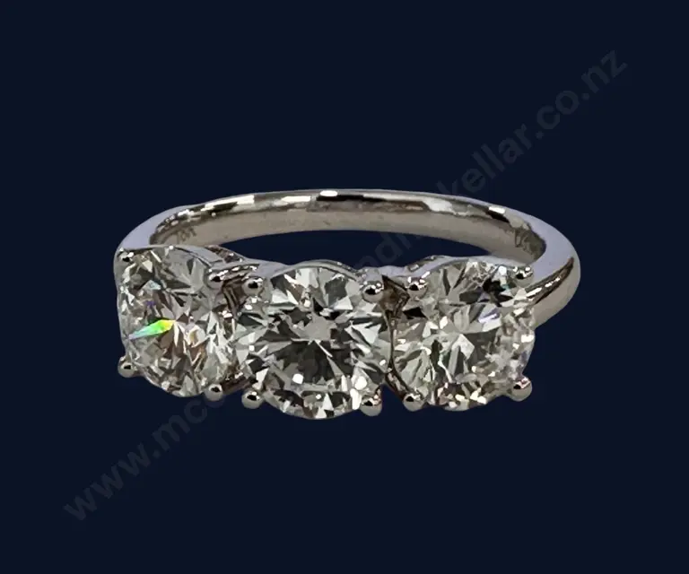 18ct White Gold Ring, 3ct lab diamond 3 stone ring, TW4.54gms, Valuation $9000 Estimate: $3,000 - $5,000