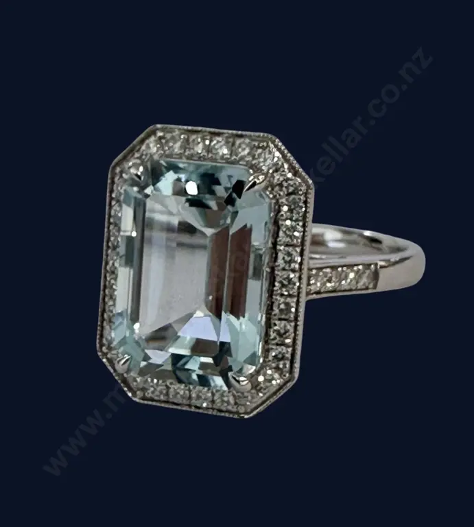 18ct White Gold Ring, 5.42ct Aquamarine, 38 Diamonds 0.38ct, TW5.987gms, Valuation $10,000 Estimate: $3,500 - $5,000