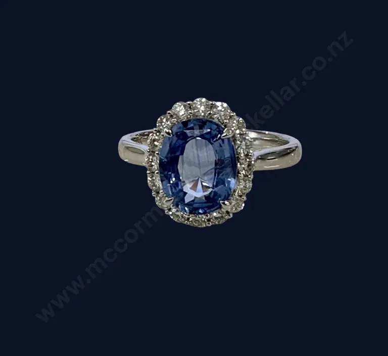 18ct White Gold Ring, 3.34ct Sapphire, 16 Diamonds, 0.56ct, TW4.85gms, Valuation $17,900 Estimate: $5,000 - $8,000