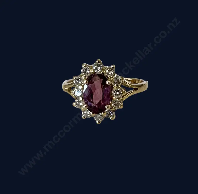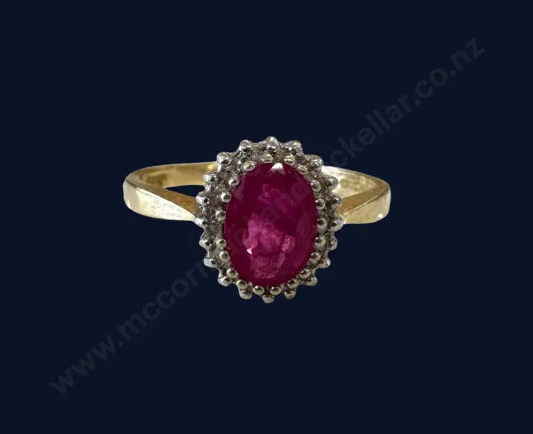 18ct Ruby and Diamond Cluster Ring, Ruby 1ct, Valuation $7,100.00 Estimate: $2,000 - $3,000