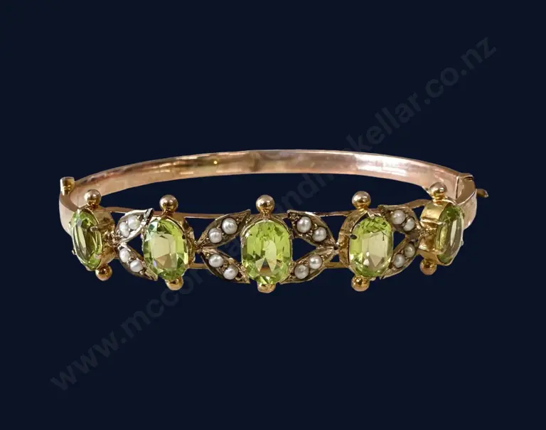 9ct Gold Peridot and Seed Pearl Victorian Bangle (dents), TW7.4gms Estimate: $400 - $800