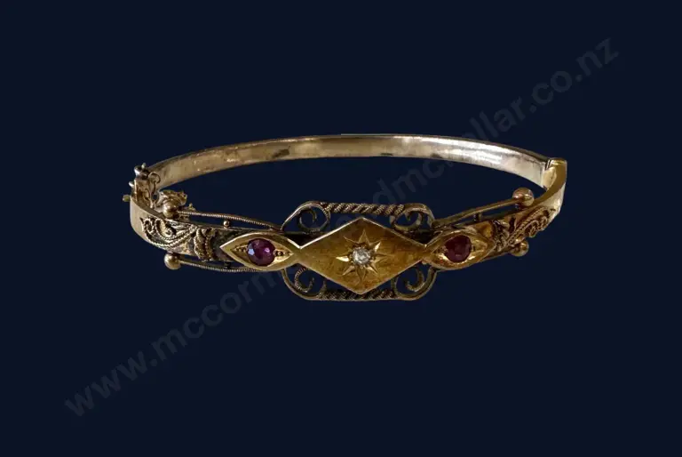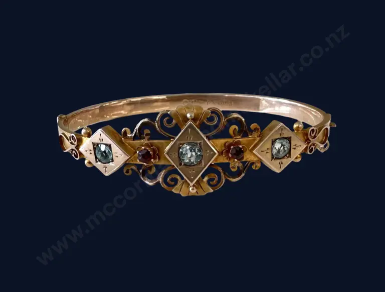15ct Gold Victorian Snap Bangle with Diamonds and Garnets TW11.3gms Estimate: $850 - $1,500