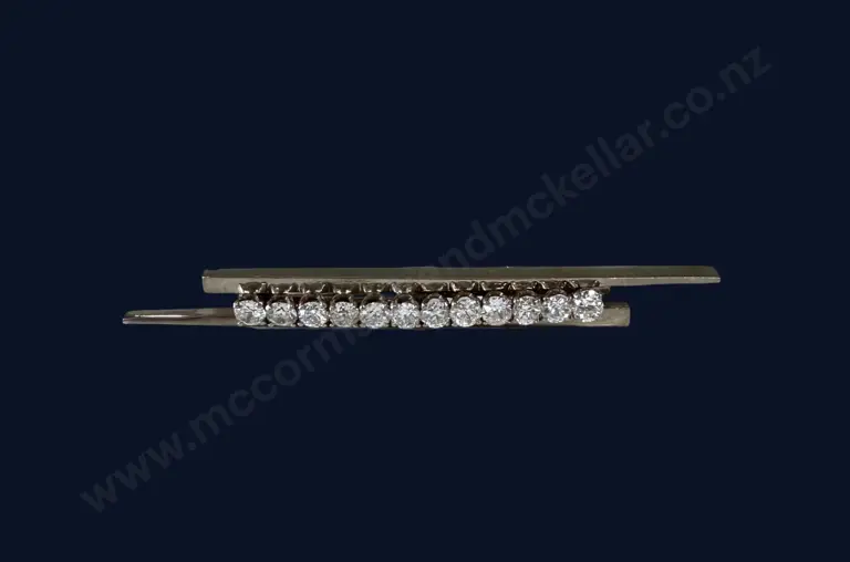 18ct White Gold Diamond Bar Brooch, TW 6gms, Valuation $5,000.00 Estimate: $600 - $1,200