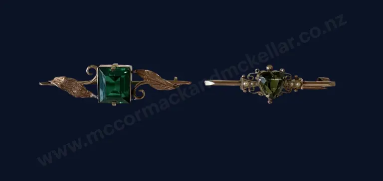 9ct Gold Tourmaline and Seed Pearl Heart Brooch and 9ct Gold Synthetic Emerald Bar Brooch, TW 7.7gms Estimate: $350 - $700