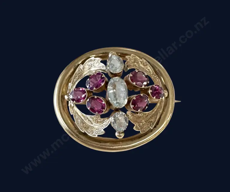 9ct Gold Aquamarine and Garnet Brooch, TW 11.6gms Estimate: $500 - $1,000