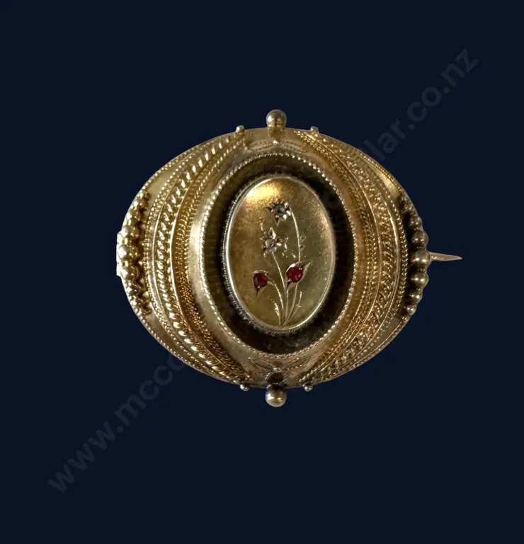 9ct Gold Diamond and Garnet Oval Brooch, TW 10.7gms Brooch Estimate: $500 - $1,000