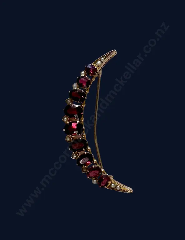 9ct Gold and Garnet and Seed pearl Crescent Brooch, TW3.8gms Estimate: $200 - $400