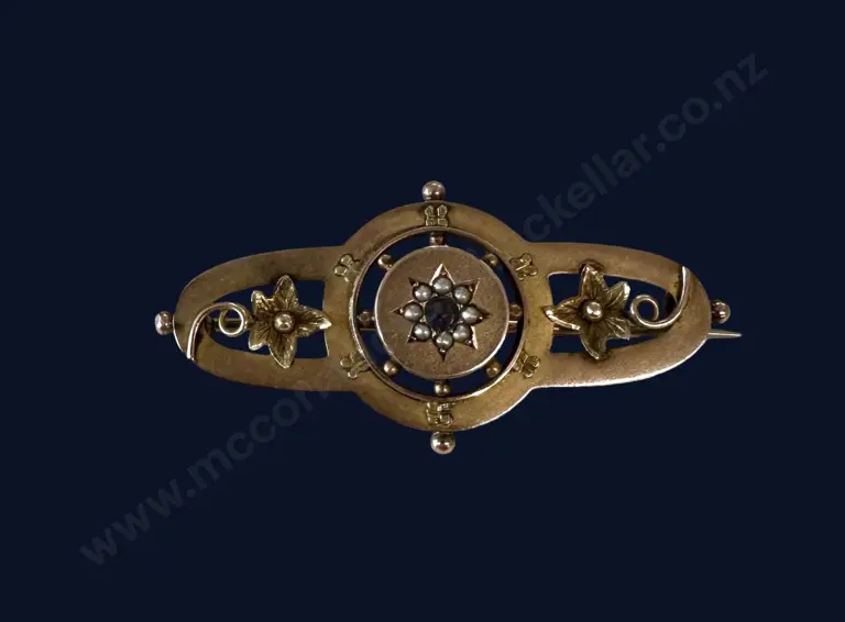 9ct Gold Sapphire and Seed Pearl Bar Brooch, 3.2gms Estimate: $150 - $300