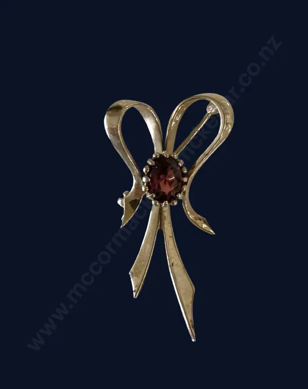 9ct Gold Garnet Bow Brooch TW4.9gms, Valuation $325.00 Estimate: $250 - $500