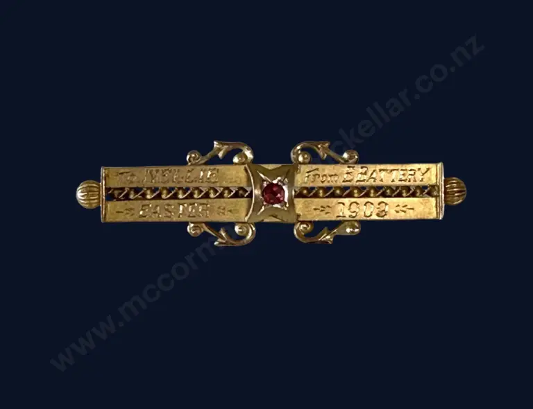 15ct Gold Ruby Centre Bar Brooch TW2.8gms Estimate: $200 - $400
