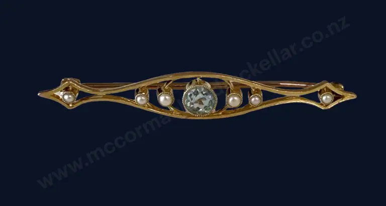 15ct Gold Blue Topaz and Seed Pearl Bar Brooch, TW 3.1gms Estimate: $200 - $400