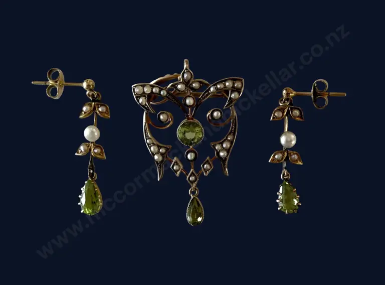9ct Gold Peridot and Seed Pearl Pendant/Brooch with matching Earrings, TW 5.5gms Estimate: $250 - $500