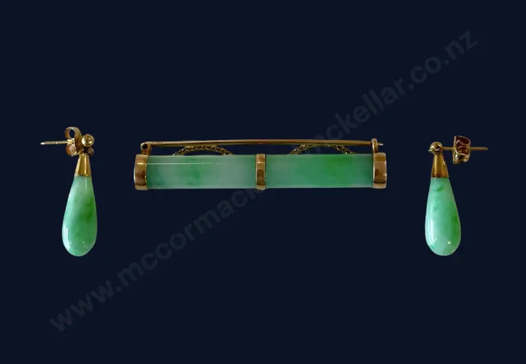 18ct Gold Jade Brooch with matching Drop Earrings Estimate: $150 - $300