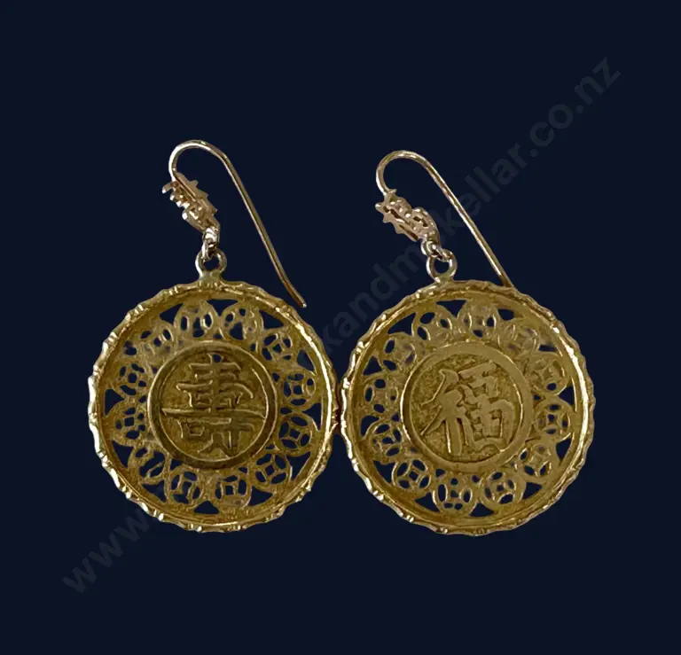 14ct Gold Chinese embossed Drop Earrings, TW 9gms Estimate: $600 - $1,200
