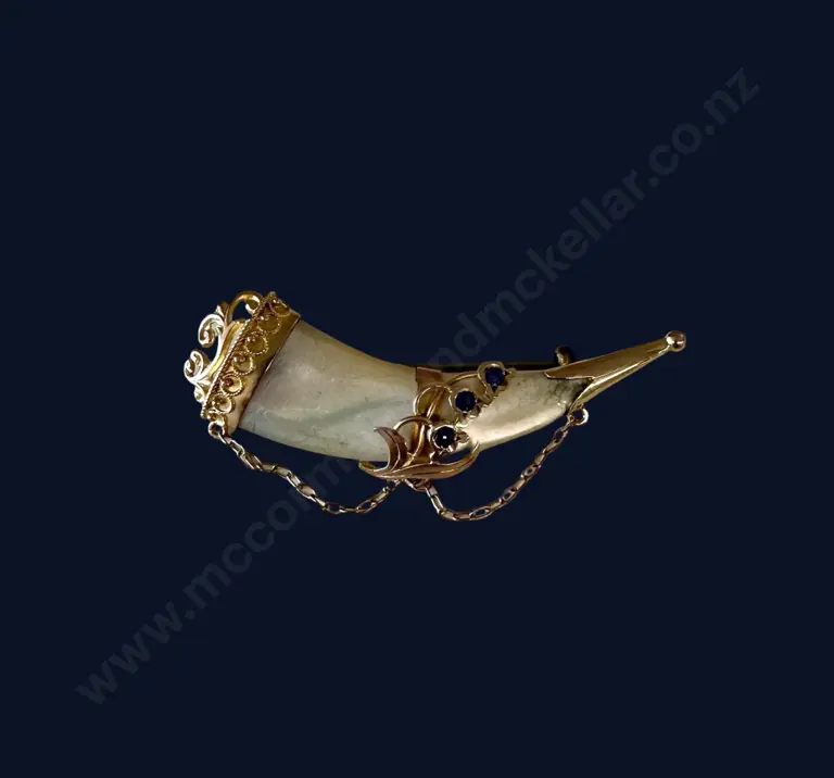9ct Gold Mother of Pearl Horn shaped Brooch set with Sapphires Estimate: $100 - $200