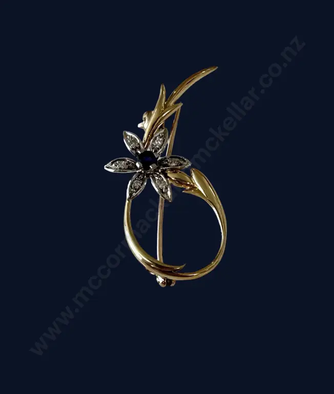 18ct Gold Sapphire and Diamond Set Floral Brooch TW3.4gms, Valuation $685.00 Estimate: $300 - $500