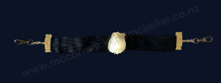 Black Ribbon Bracelet with 9ct Gold Shield and clasps, L26cm Estimate: $100 - $200