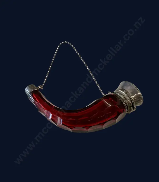 Sterling Silver mounted Horn Shaped Ruby Glass Scent Bottle, L8cm Estimate: $100 - $200