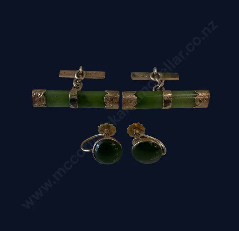 Pair of Greenstone and 9ct Gold Cufflinks and Greenstone Earrings Estimate: $200 - $400