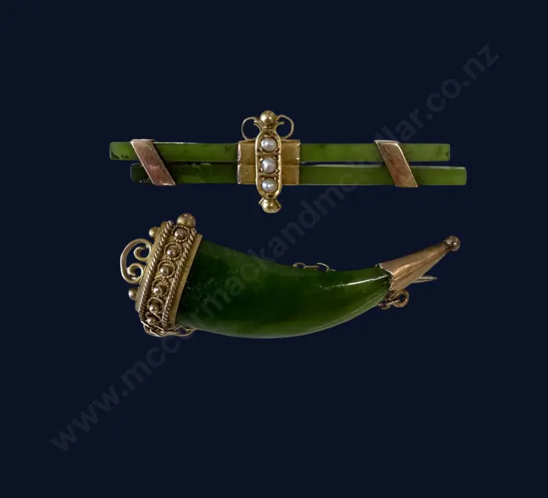Two Greenstone and Gold Mounted Brooches Estimate: $200 - $400