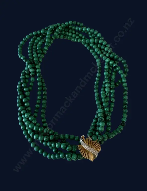 Six Strand Malachite Necklace with 14ct Gold and Diamond Clasp L40cm Estimate: $150 - $300