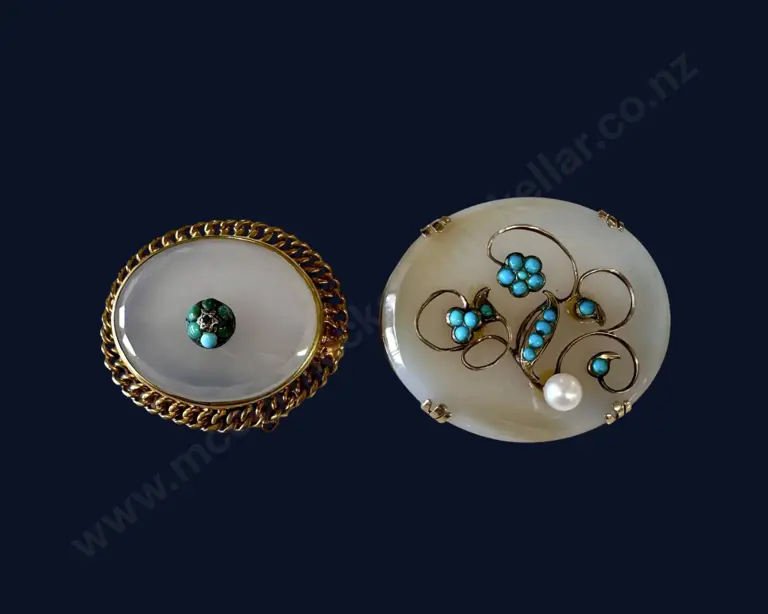 Two Victorian Gold Milk Glass Brooches with Turquoise and Pearl Floral Inset Estimate: $50 - $100