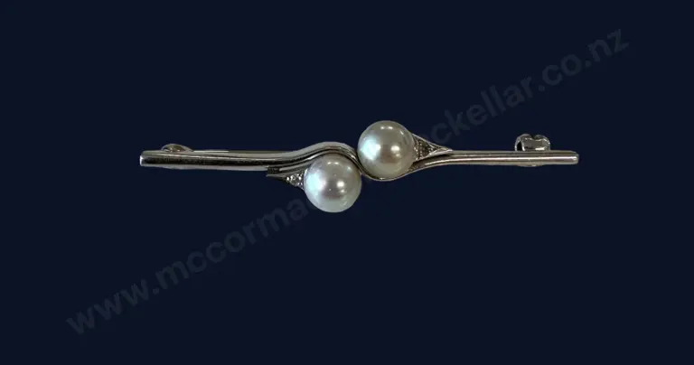 9ct Pearl and Diamond Bar Brooch TW3.7gms, Valuation $395.00 Estimate: $150 - $250