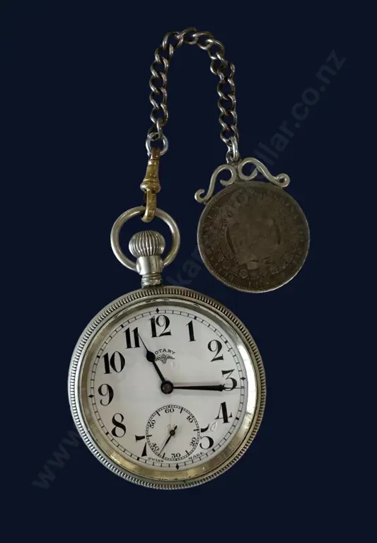 Rotary Pocketwatch with 1887 British 1/2 Crown on Fob Chain Estimate: $50 - $150