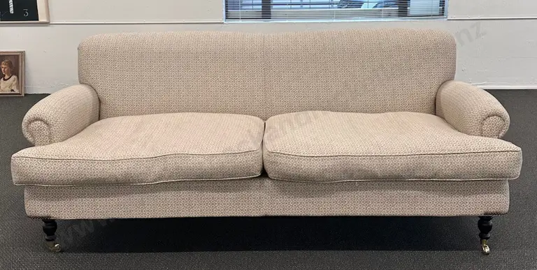 Scroll Arm Sofa with Feather Cushions Upholstered in Nicholas Herbert Fabric , L215x W100xH88cm