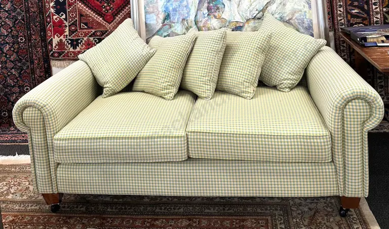 Two seater Rolled Armed Sofa upholstered in Checked Seersucker, L195cm