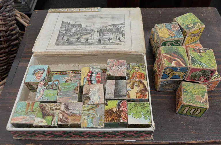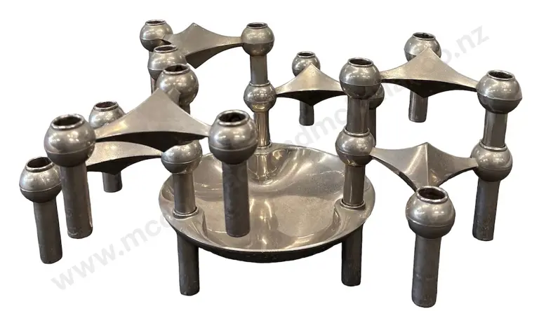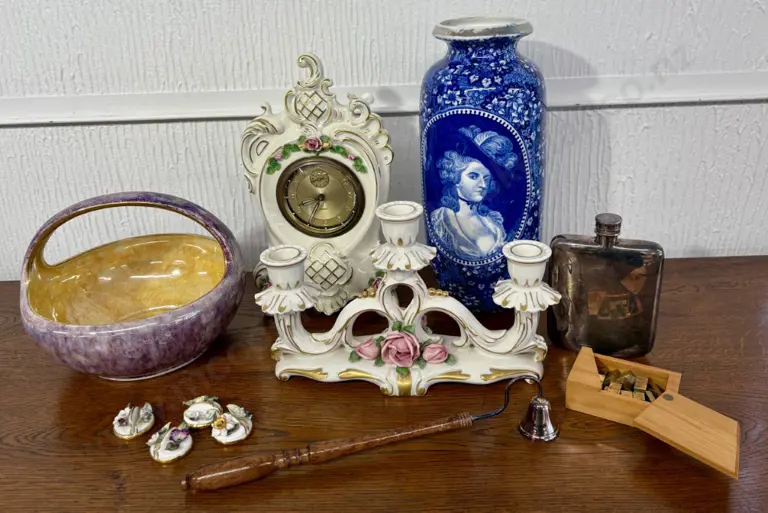 Dresden Clock and Candelabra, Blue and White Vase, Lustre Basket, Candle Snuff, boxed brass dominoes 4 place name