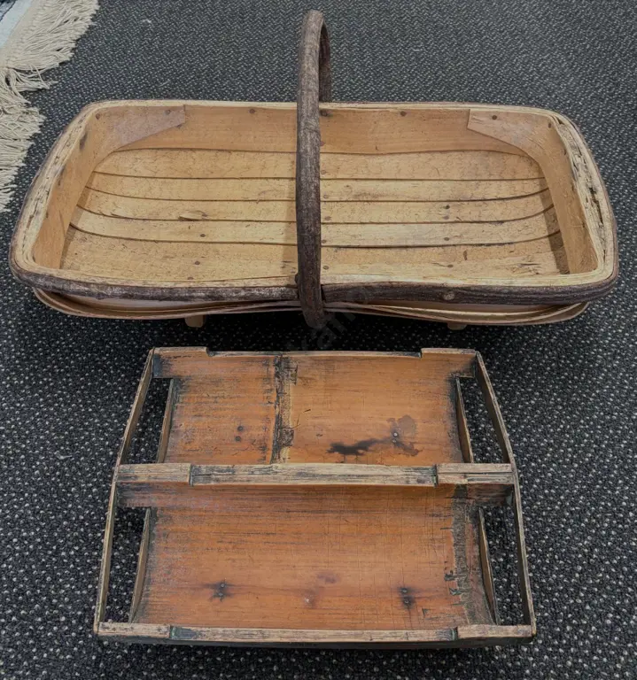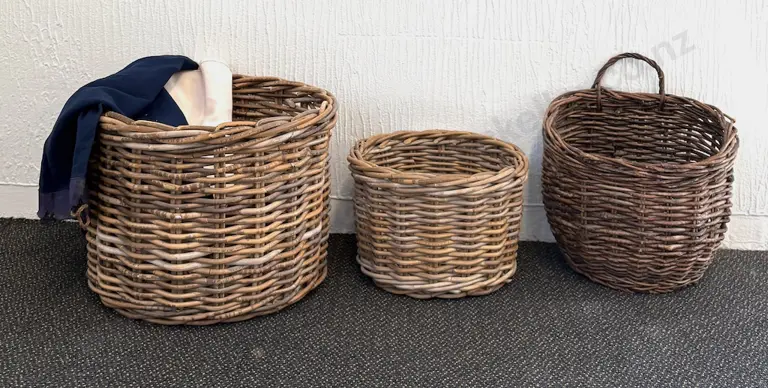 Two Cane Baskets and one old Bicycle Basket an old French Flag, and a white wooden kitchen stool H47cm