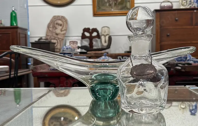 Art Glass Bowl with Hollow Domed Base L53cm, Glass Decanter with Sterling Silver Whisky Label
