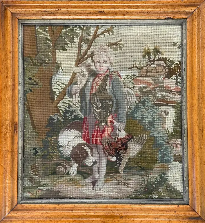 Birdseye Maple Framed Tapestry 570x525mm and Oval Gilt Framed Lake Scene Print 390x495mm