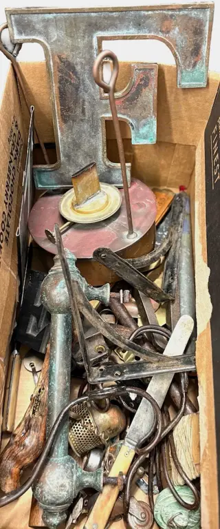 Box of metal brackets, letters, thermometer, tools, castors etc