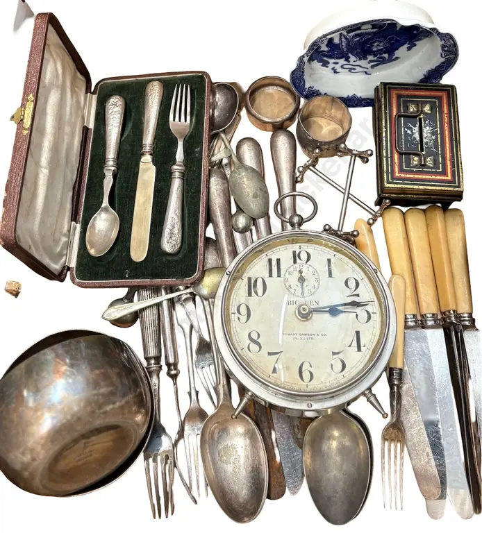 Box of assorted EPNS cutlery, dishes, clock, napkin rings etc.
