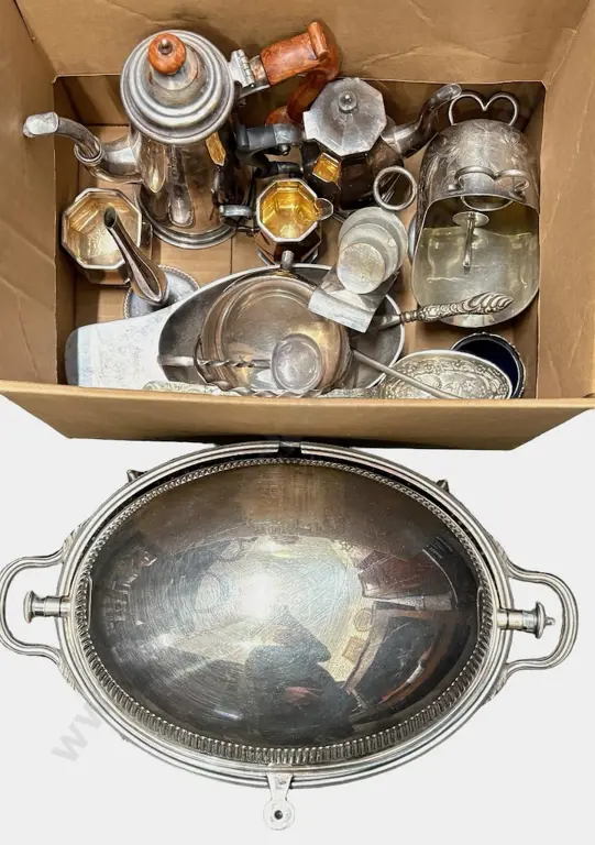 Silver Plate Roll Top Footed Dish, Heron Serving Spoons, Coffee Pots, Mustard Pots, etc