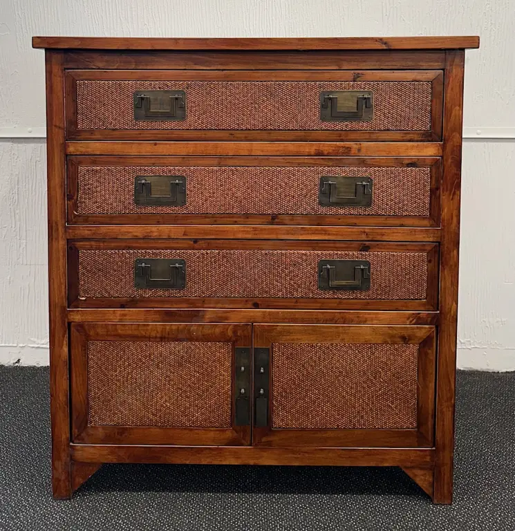 Oriental Three Drawer, Two Door Chest with Rattan Panels H100xL90xD56cm
