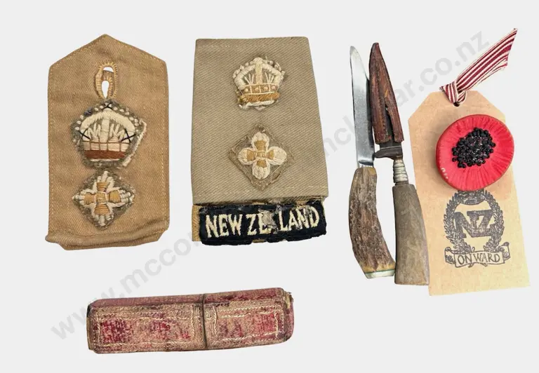 NZ WWII Lieutenant Colonel Epaulettes and NZ Poppy Pin, Leather Cased MOP Pocket knife and two others