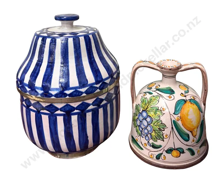 Blue and White Handpainted Liddled Container and Two Handled Ceramic Flask with Lemon and Grape Motif H18cm and 25cm