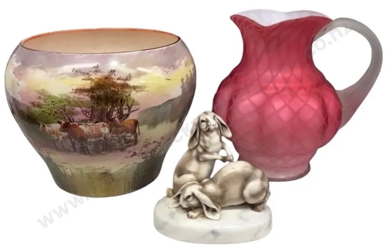 Winton Grimwades Jardiniere, Porcelain Rabbit & Victorian Diamond Pattern Art Glass Pitcher