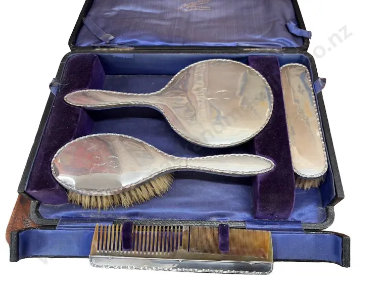 Boxed Sterling Silver Vanity Set - Mirror, Hairbrush, clothes brush and comnb