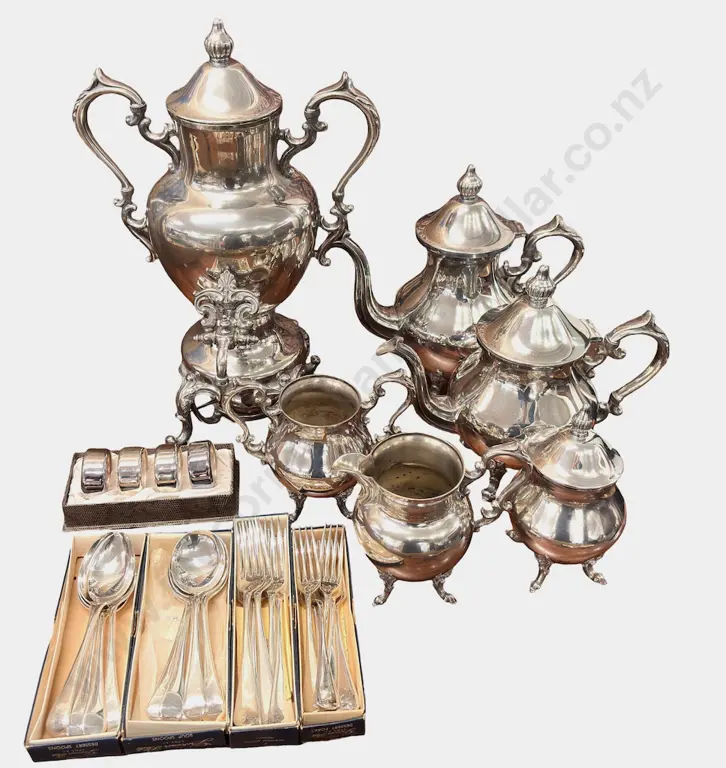 Silver Hot Water Urn, Coffee and Tea Service, Cutlery and Napkin Rings