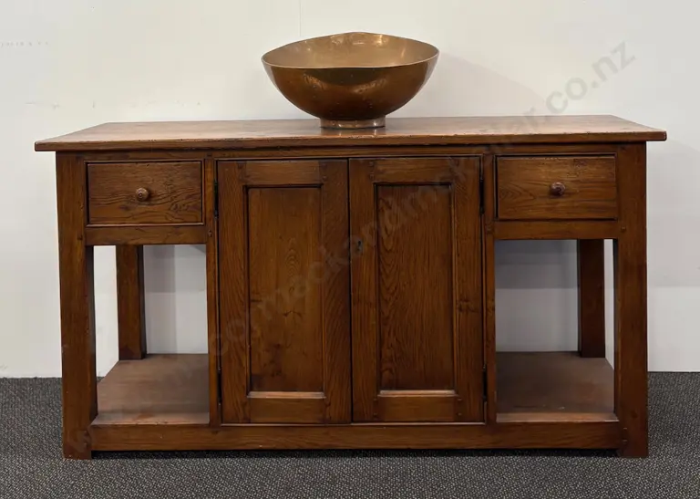 Solid Brass Hand Basin, attrib. to John Britten, on Oak Wash Stand H68xL130xD45cm - stand