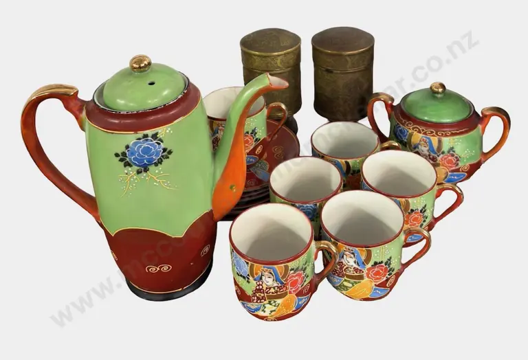 Japanese Porcelain Tea Set, AF & Two Brass Lidded Pots H10.5cm
